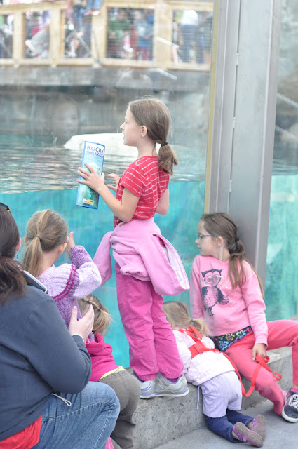 Pearl was enthralled. She seemed content to watch the windows for long stretches of time. The large seal lion was nifty although we were quickly distracted by the Polar Bear. The tank is very cool with a great above and under water view. I was below and I snapped a picture of the girls watching from above.