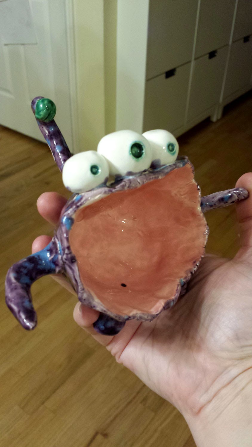 First, you must see the monster June made. In art at school, they were experimenting with the clay medium. June came home with this little devil. (Well, maybe he is more of a fish...lizard...alien...type thingy.) Oh, wait. He is a monster. That is exactly what he is. Three eyes, a poisonous tail, and a huge mouth. (But don't worry, he doesn't have any teeth to bite you. Just watch out for the tail.)