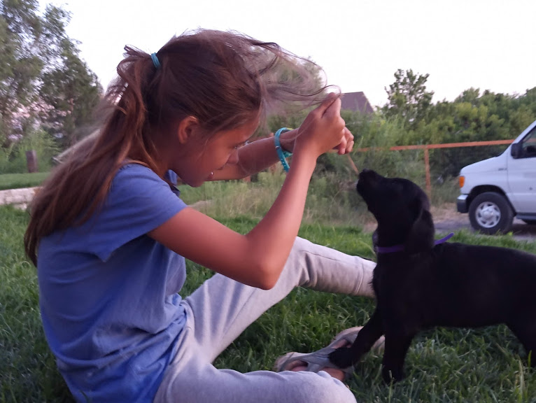 My girls were a little heartbroken as each puppy left. Luckily a couple went to neighbors so we still see them around. When the puppies got bigger, we would often find them on our doorstep exploring their world. They were always surprised and excited to see the girls, their other mothers. Such cuties. Now that it is fall, they are hardly puppies at all, but I'm glad the girls got to experience each step along the way.