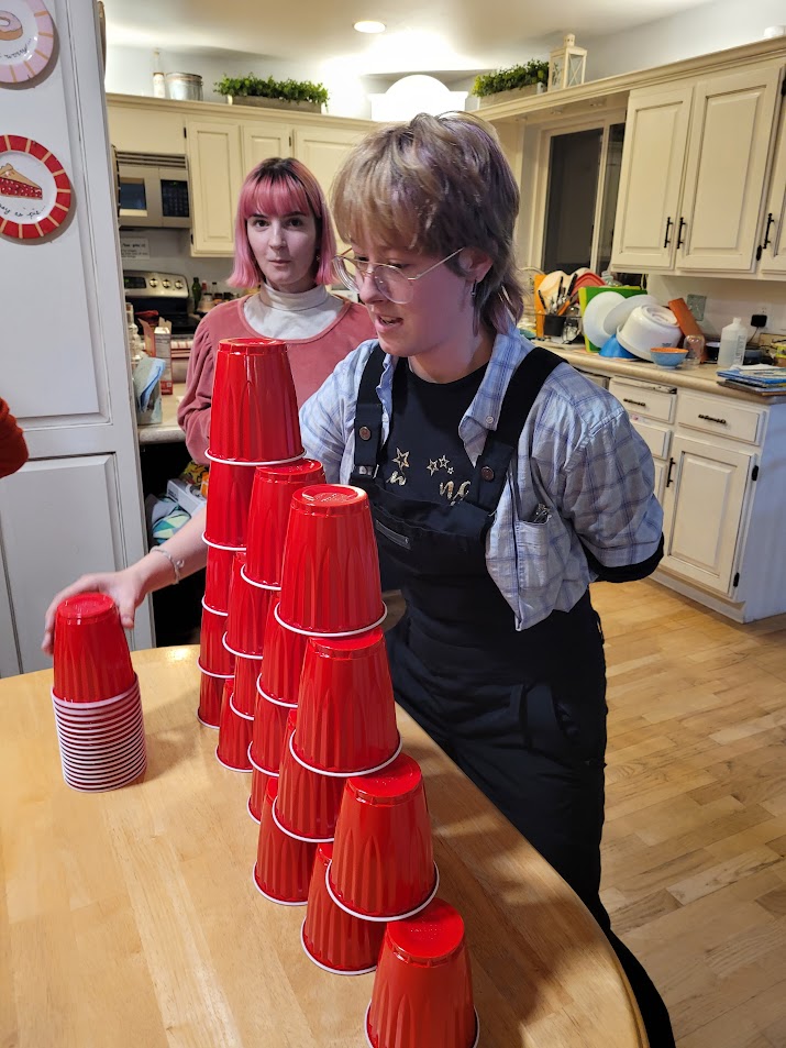 Then we played some Minute to Win It games, Christmas style. Everyone drew dice (this is my version of drawing straws) to find which game they would play. Liberty, Tyler, Annika, and Beau drew stacking cups. In retrospect, there were too many cups, but it made it more challenging. The task was to stack all the cups and then take them down again, all using one hand. It was a struggle, but everyone did pretty well. You can't tell from these pictures, but Beau won!